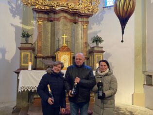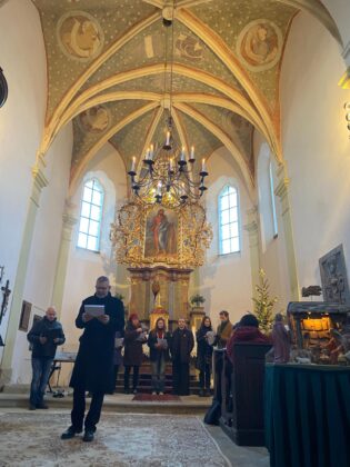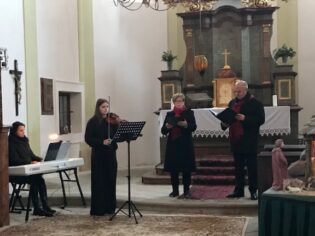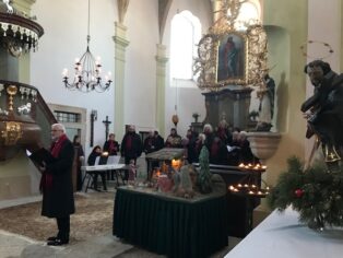 svým zvučným hlasem všechny přivítal a tak začalo naše každoroční zpívání pod taktovkou Kateřiny Štolové, která připravuje celý program. Střídalo se mluvené slovo, zpěv známých koled, kdy všichni zpívali, s vystoupením hostů. V kostele zazněla hudba v podání solistů, a to Tria Cum amore, Alžběty Marie Štolové, Eliany Vrchlavské a Adama Štoly s mladou zpěvačkou Giulliou Amerighi. Nechybělo ani betlémské světlo, které nám přinesli lounští skauti. Zpívání skončilo koledou Narodil se Kristus Pán, ještě jsme si popřáli klidné a šťastné vánoce a se světýlky jsme se rozešli k našim domovům. Budeme se těšit, že se opět za rok sejdeme.