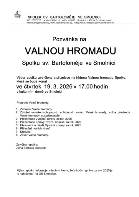 IČO: 27013227, zapsán KS Ústí n.L., odd.L vl.5555, Smolnice 1, 439 14 Smolnice, e-mail: hvrchlavska@seznam.cz www.kostelsmolnice.cz,